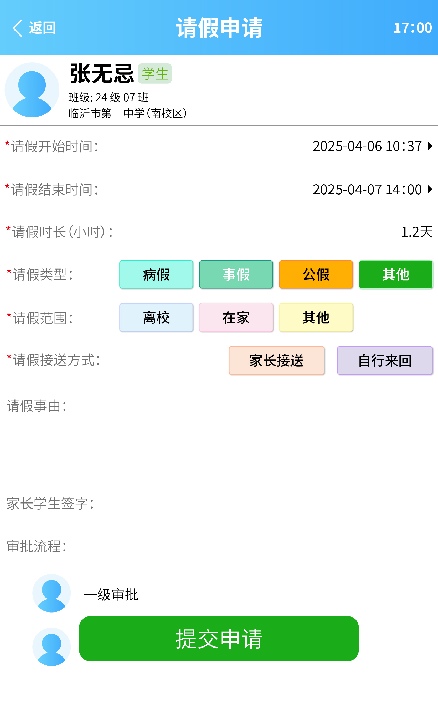 刷脸发起:学生通过视频话机刷脸进入个人中心,选择请假类型(如病假、事假、紧急离校)并填写起止时间、事由等信息。 证明材料上传:支持拍照或上传电子版医院证明、家长手写说明等附件,系统自动压缩文件以适配网络传输